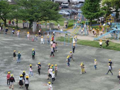2時間目の授業が終わって、大放課が始まり、外で遊んでいる子がたくさんいます。けれど、今日はあまり晴れていないせいか、いつもより人が少なく感じます。お、そろそろ3時間目が始まりそうです。3時間目も頑張りましょう!