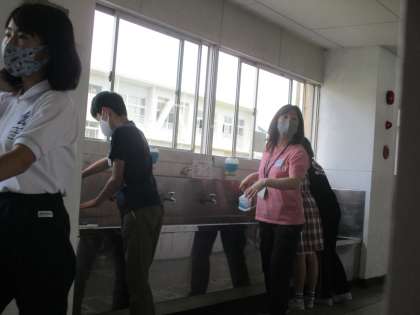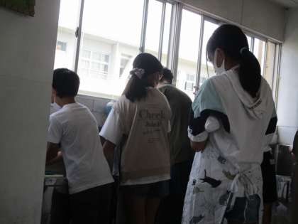 全校児童が手洗いをしています。 石けんでしっかりと洗い,コロナ対策をしています。