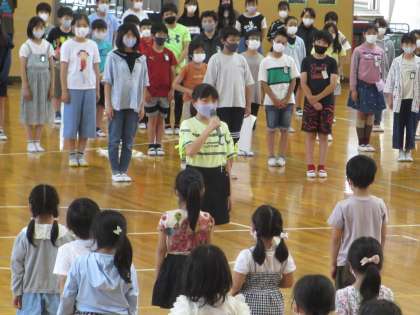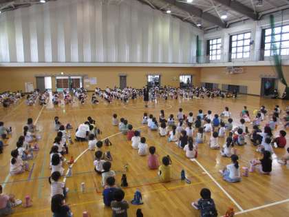 本年度の「1年生を迎える会」も、昨年度に引き続き、全校児童がアリーナに集まって行うことができませんでした。でも、児童会のクイズや、2年生から6年生の発表を順番に見て、1年生の目がきらきら輝き、「かっこいい!」と思っている様子が感じられました。