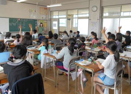 5年生の算数の授業で、小数×少数のかけ算を学習しています。最初に、前回の授業で習った小数×小数の計算の仕方を、練習問題で確認しながら復習しました。どんどん手が挙がり、計算式を発表していました。