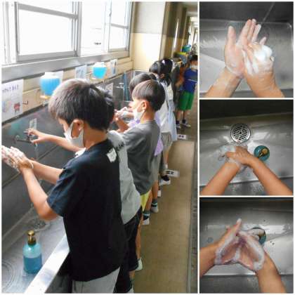 5/18 今日のあわあわゴッシーさん 公開日 2021/05/18 更新日 2021/05/18 保健室 給食前の手洗いの様子です。あわあわゴッシー頑張っていました。指の間、爪の中、親指、手首と、ゴッシーの歌に沿ってくまなく洗えました。ぴかぴかの手で給食の準備スタートです。
