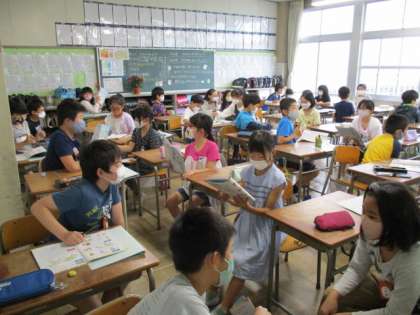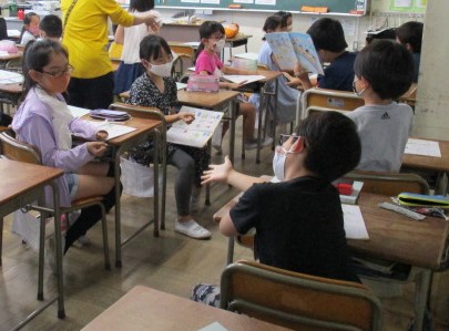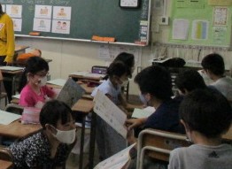 外国語活動の授業で、天気の言い方と遊びに誘う言い方を学習しています。先生と一緒に何回か練習して、言い方に慣れてきたところで、ペアでやりとりをしました。天気についてやりとりしたあと、天気に合わせた遊びに誘います。どちらから質問するかを、最初に英語じゃんけんで決めて、対話が始まります。「晴れだね」「おにごっこしよう」「雨だね」「トランプしよう」・・・などと、本当の天気のやりとりではないけれど、どんな遊びがしたいかの気持ちが、対話に表れていました。