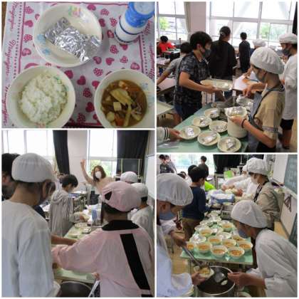 給食の時間が始まりました。今日の献立は、ご飯、牛乳、呉汁、鮭のおろしだれ銀紙焼きです。今日の呉汁には、さといもが入っています。さといもは、日本では稲よりも早く栽培が始まったとされています。山に生えている「やまいも」に対し、人が暮らす里で栽培されたことから「さといも」と呼ばれるようになったそうです。
