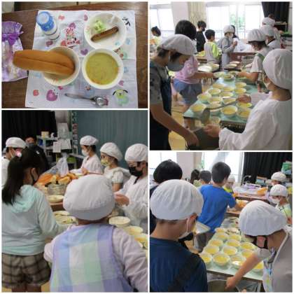 写真は5年生の給食の様子です。給食当番が手際よく配膳を進めています。さすが高学年ですね。準備が整い、笑顔で「いただきます!」