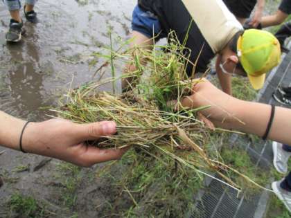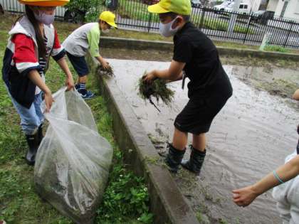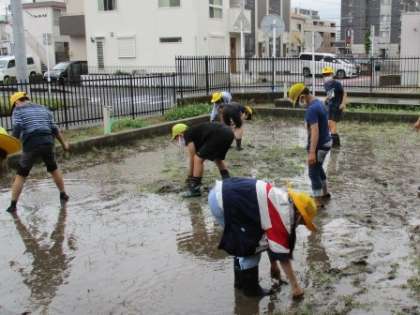 雨があがった清掃時間、5年生の子たちが学校内の田んぼに集まってきました。土がぬかるんだ中に入って、みんなで田植えの準備をしました。泥の中、楽しそうに作業をしました。草もたくさん抜きました。田植えが楽しみです。ズボンや靴下が泥で汚れてしまった子も・・・。ごめんなさい・・・。