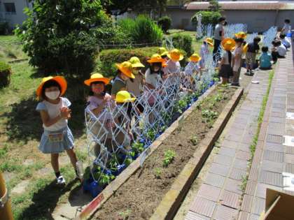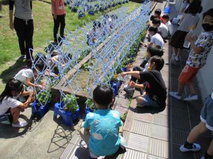 6/9 1年生 ぐんぐん伸びてね 公開日 2021/06/09 更新日 2021/06/09 1年生 アサガオが、ぐんぐん伸びるように、2つのことをしました。 ひとつ目は、肥料をあげたことです。袋から肥料を出して、自分の鉢にそっと置きました。栄養満点の肥料で、アサガオも元気アップです。 ふたつめは、支柱をつけたことです。これからもっと大きくなって、つるが伸びてきたら、今日付けた支柱に、くるくる巻き付きます。楽しみです。 明日からも水やりを頑張ります!