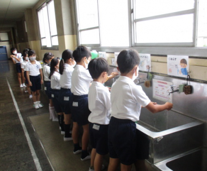 9/14 朝の手洗い 公開日 2021/09/14 更新日 2021/09/14 保健室 写真は、朝の手洗いタイムの様子です。順番に並んで手洗いをしていきます。あわあわゴッシー手洗いで、ぴかぴかの手で今日も元気に過ごします!