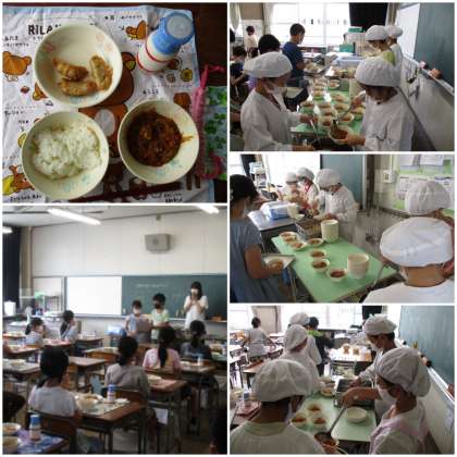 写真は、4年生の準備の様子です。毎日の流れに従って、自分たちでどんどん準備を進めていきます。マーボー春雨と揚げギョーザのいい匂いが、教室中にひろがってきました。準備が整い、今日も笑顔で「いただきます!」