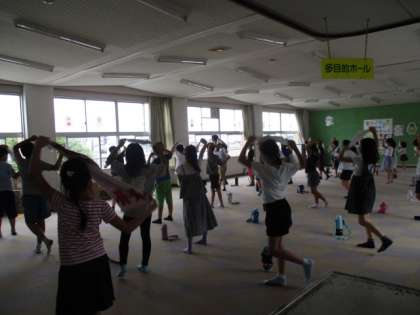 9/14 4年生 ノリノリで 公開日 2021/09/14 更新日 2021/09/14 4年生 4年生の体育祭の表現は、手にスカーフをもって踊ります。今日は、多目的室でクラスみんなで踊ってみました。動きがとても上手です。間をしっかりととり、布をもってノリノリで踊っていました。これから学年みんなで練習していきます。楽しみですね。