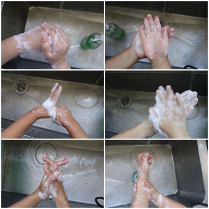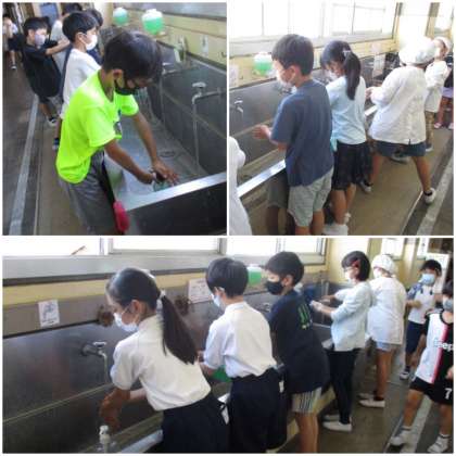 給食前の手洗いタイム、通称ゴッシータイムになりました。今日も手洗い場には、すてきなあわあわゴッシーさんがたくさんいました。みんな自然に「あわあわゴッシー」の歌の通りに手を洗っていて、見本になるような手洗いでした。ぴかぴかの手になって、給食の準備を始めます。