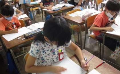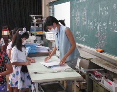 算数の授業で、3けたのひっ算を学習しました。先生と一緒に問題をいくつか解いたあと、自分のノートに、どんどん問題を解いていきました。みんな集中してがんばりました。答えを書いたら、先生にノートをチェックしてもらいました。〇をもらってうれしそう。