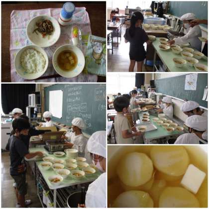 給食の時間が始まりました。今日の献立は、ご飯、牛乳、十五夜汁、五目きんぴら、お月見だんごです。今年は、9月21日が十五夜です。十五夜には、ススキ、だんご、さといもなどをお供えして、お月見を楽しむ風習がありますが、作物の豊作を願う収穫祭の意味もあります。今日の給食は十五夜にちなんで、さといもや月の形をしたかまぼこが入っています。