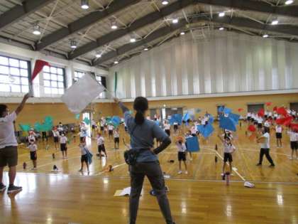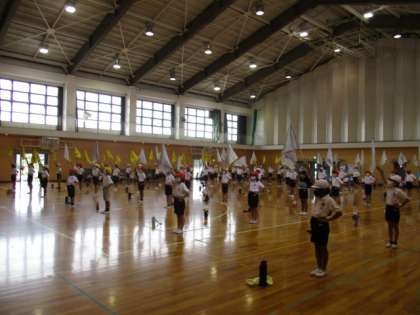 アリーナで体育祭の表現の練習をしました。3クラスと2クラスに分かれて、実際に動いてみました。旗が一斉に動くと、とてもきれいです。大きく、美しくを目指して、みんなで頑張ります!