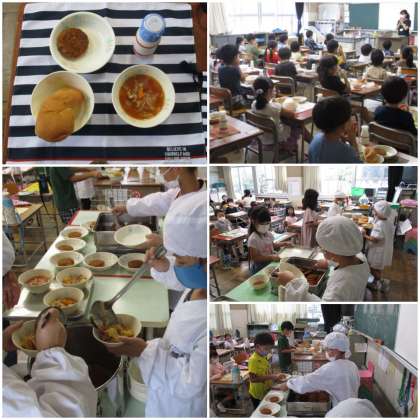 写真は、1年生の準備の様子です。1年生の成長はすごいです。みんなで協力してどんどん準備が進めていきます。大きいおかずの当番さんは、みんなのお椀に具と汁のバランスがちょうどよくなるように、丁寧につけ分けていました。準備が整い、今日も笑顔で、感謝して「いただきます!」