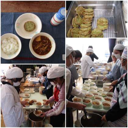 写真は、6年生の準備の様子です。6年生は配膳室から最も遠く、教室へ到着するのに時間がかかりますが、到着するとあっという間に準備ができあがってしまいます。ここでも最高学年としての力量が発揮されています。豚汁は、さといもを含めて具がいっぱいでおいしそう!天ぷらは給食で出されるのは珍しいです。はんぺんのような平たい形に、「中身は何だろう・・・」献立表を見て大豆ととうもろこしの天ぷらと知り、「初めて食べる・・・」と言っていました。