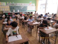 この絵は校内の作品展で飾られた後各家庭に持ち帰り、おうちの人の前で発表会を行います。