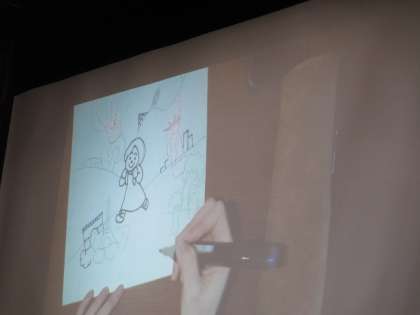今日は、山下さんのおはなしを聴きました。写真は、6年生のみんなの前で、おはなしをしながら、絵を描いてくれているところです。ペンは120色くらいあって、いろいろな色や太さのペンを使ってどんどん描いていて、とてもかっこよかったです。