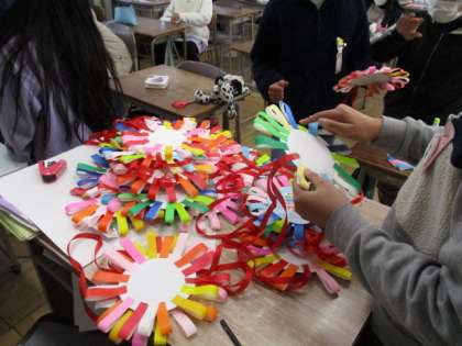 2/7 1年生から5年生まで 心をつなぎます 公開日 2022/02/07 更新日 2022/02/07 人権教育 送る会に向けて準備を進めています。写真のものは、1年生から5年生まで順番に作っていき、5年生が最後の仕上げをします。1年生から5年生まで心をつないでいきます。みんなの思いが6年生に伝わりますように・・・。