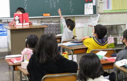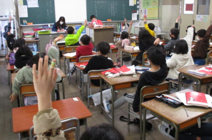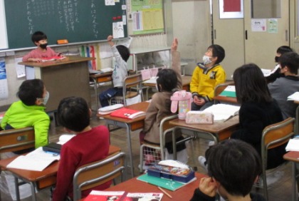 国語の授業で「これはなんでしょう」を学習しています。これまでの授業で、学校にあるものについてのクイズを準備をしてきました。ものの形や働きの伝え方、ヒントの出し方などをノートにまとめました。そして、今日は「これはなんでしょう クイズ大会」です。順番に前に出て出題します。「これは丸いです」みんなは聞いた言葉を頭の中で巡らせて答えを考え、たくさん手が挙がります。だれかが発表すると、出題した子から「正解です」か「違います」と言われて、みんな一喜一憂しながら、頭をしっかり働かせていました。