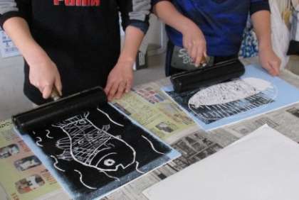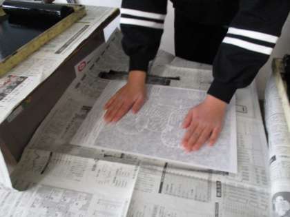 図工の授業で、「ほってすって見つけて(木はん)」に取り組んでいます。今日はいよいよ刷りです。コロコロとローラーを動かしてたっぷりインクを付け、紙をおいてていねいに上から押さえて刷りました。ゆっくり紙をはがすと、とってもきれいにインクが付いていました。いい感じです。