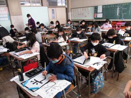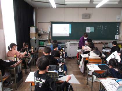 2/9 3年生 書写 総まとめ 公開日 2022/02/09 更新日 2022/02/09 3年生 書写の授業では、学習のまとめとして「光」を練習しています。たて画、点、左はらい、横画、左はらい、曲がり、はねと、今まで習ってきた筆使いのポイントを思い出しながら書きました。先生から「お部屋を守って」のアドバイス。バランスよく書くために大切です。お手本を見ながら気をつけて書いていました。みんな全集中でした。