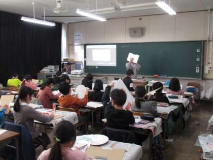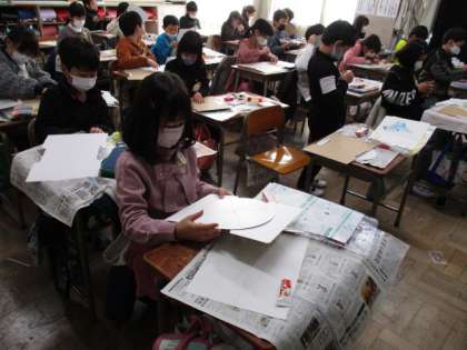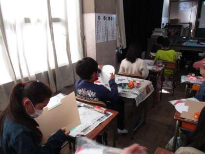 図工の授業で「くるくるランド」を作ります。四角の台に丸い盤を回るようにつけます。360度をいくつかの場面に分けて、自分の世界を作っていきます。季節で分ける、時間軸で分ける、場所や場面で分けるなど、どんな世界を作ろうか頭の中でくるくると考えていました。今日は一番大切な土台作りです。説明の用紙を一生懸命読みながら、組み立てていました。