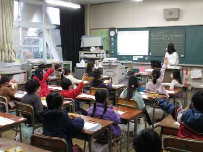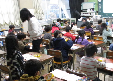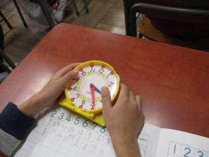算数の授業で「なんじ なんぷん」を学習しています。先生から「〇時〇分を時計の文字盤であらわしてみよう」や「時計の時は何時何分でしょう」の問題が出されました。黄色いマイ時計の針を動かしながら、長針と短針のさす目盛りをよく見て時刻を考えていました。特に短針は、2と3の間?3と4の間?迷いがちですが、みんなしっかりと理由をつけて答えていました。時計のよみ、ばっちりです。