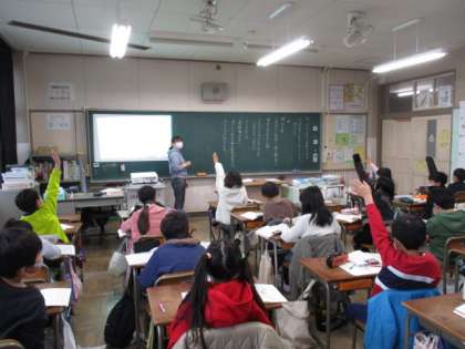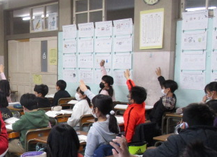 国語の授業で「わたしの学校じまん」を学習しています。今日はわたしたちの学校、神山小学校の自慢に思うことを出し合いました。たくさん手が挙がって、次々と神山小自慢が出てきました。