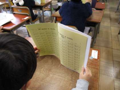 音声計算のつづりを作りました。ワークシートを1枚ずつのりで貼っていきました。貼り終わったら、本のように出来上がりました。今日は3枚はりましたが、できるようになったら、どんどんふやしていけます。すいすい計算ができるようにがんばります!