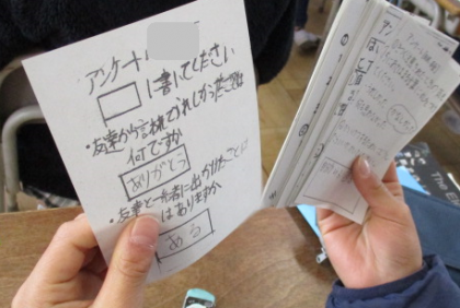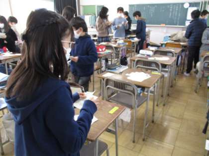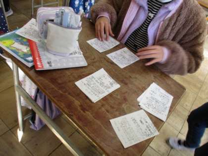 国語の授業で、「提案しよう、言葉とわたしたち」を学習しています。普段何気なく使っている言葉に注目して、もっと生活を豊かにできる使い方を工夫しようと、自分で課題を立てて取り組んでいきます。今日は、自分の課題についての調査を、クラスのみんなと出し合いました。授業の最後に、みんなからのアンケートが、続々と集まってきました。早速興味深く見ていました。すぐ仕分けをし始める子もいました。何か感じたようですね。この後、アンケートから考えを深めていきます。