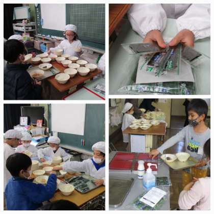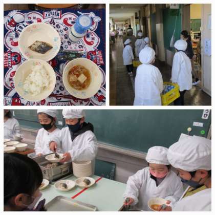 給食の時間が始まりました。今日の献立は、ご飯、牛乳、ちゃんこ汁、さわらの香味だれ、味付け海苔です。今日は、「はし使いを意識する献立」の日です。はしには、「つまむ、はさむ、すくう、さく、のせる、はがす、ほぐす、くるむ、切る、運ぶ、混ぜる」などのさまざまな使い方があります。にんじんやだいこんなどの食材をはさむ、さわらの身をほぐすなど、はし使いを意識して食べましょう。