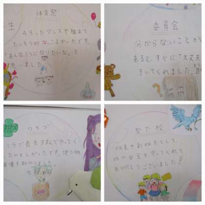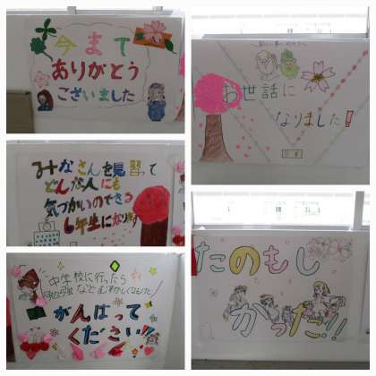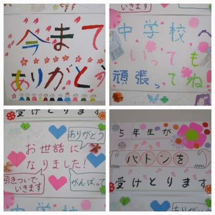 6年生の登校日が、今日を入れて残り10日となりました。6年生の教室前廊下に掲示してある5年生からのメッセージのことばが、じわりじわりと心にしみてきます。6年生がみんなを広く大きく支えてくれことが、5年生のことばからわかります。そして、引き継いでいく5年生の思いも伝わってきます。バトンが渡る日、もうすぐです。