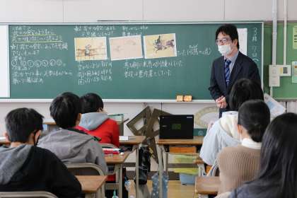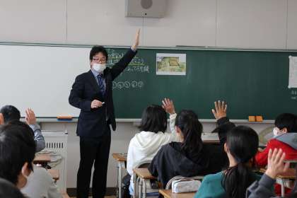 3/7 6年 出前授業5組 公開日 2022/03/07 更新日 2022/03/07 6年生 5組の出前授業は社会科の歴史でした。平安末期から鎌倉時代にかけて、武士がどのような生活を送っていたかを考える内容でした。手掛かりとなる武士の館の様子を読み取り、戦いのない普段の日々をどのように過ごしていたかを考えることができていました。小学校で学んだ歴史を、中学校でより詳しく学ぶことができます。わくわくしますね!