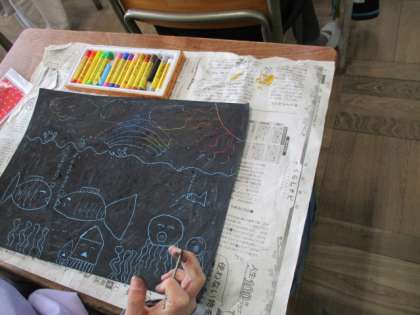 そして、今日は、つまようじや竹串などで絵を描きました。これがスクラッチです。スクラッチすると、下から最初に塗ったきれいな色が出てきました。虹色やグラデーションなど、とってもきれいな色でした。にっこりです。