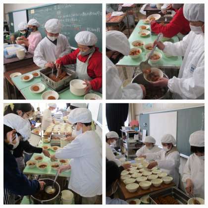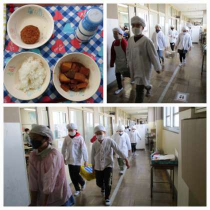 給食の時間が始まりました。今日の献立は、ご飯、牛乳、みそおでん、和風コロッケです。今日のみそおでんは、豚肉、はんぺん、うずら卵、こんにゃく、さといも、だいこん、にんじんを赤みそで煮込みました。赤みそは、愛知県などで食べられているみそです。おでんの具に赤みその味がしみ込んで、こってりしていておいしそうです。