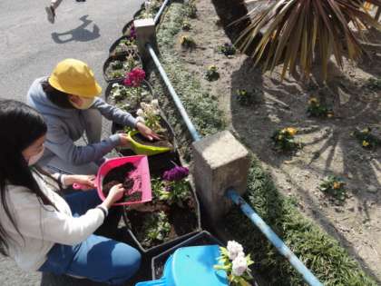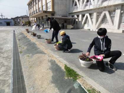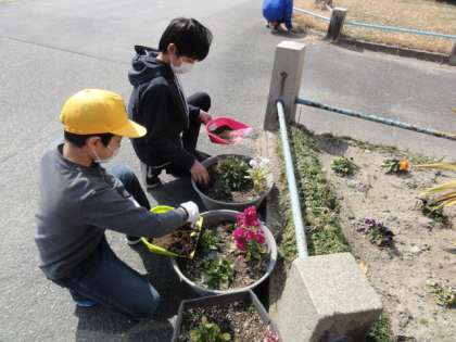 今日は、6年生の子供たちと一緒に玄関や運動場の近くにある花のプランターのお世話をしました。