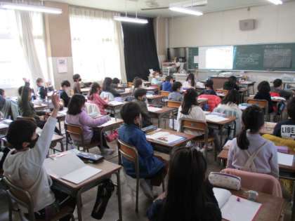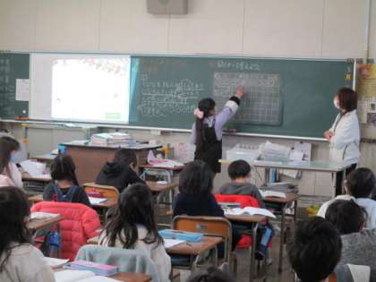 算数の授業もまとめに入ってきました。今日は、「学びを生かそう」の中の「何番目」について考えました。お楽しみ会の場面、手品をする人が11人、みさきさんの前に5人、では後ろに何人いるかな?頭を抱える問題です。まずは自分で一生懸命考えてノートにまとめました。そして順番に発表しました。考えたことをみんなの前で分かりやすく説明するのは難しいですが、当たった人は、黒板のところで一生懸命説明していました。頭フル回転です。みんなも、仲間の発表を聞いてまた考える・・・。これも頭フル回転です。しっかり考え、発表し、身に付けていきます。