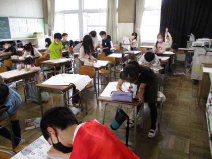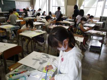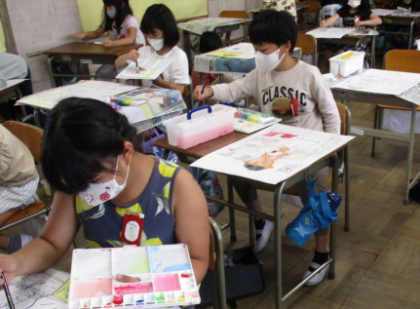 5/13 3年生 図工 ペンで1本ずつ 公開日 2022/05/13 更新日 2022/05/13 3年生 図工の授業で、リコーダーを吹いている様子を描いています。顔は手のひらくらい大きく、それに合わせて体も大きくを意識して、黒ペンで書き始めました。髪の毛は、1本1本丁寧にかいていました。目線の方向も難しいですが、いきいきと吹いている様子が表現できるとよいです。ペン書きが終わったら、背面を絵の具で色をつけていきます。なかなかの集中力でがんばっています。