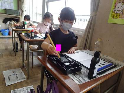 書写の授業で毛筆が始まりました。今回の授業では、墨液を使って、実際に半紙に点や線を書きました。子供たちの表情は真剣そのもの。これから一生懸命、作品づくりに取り組んでいきます。