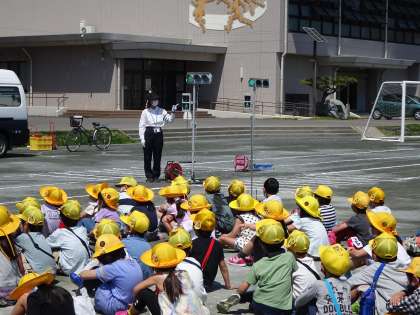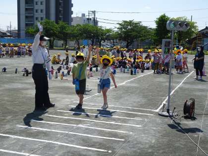 5/18 1年生 交通安全教室 公開日 2022/05/18 更新日 2022/05/18 1年生 今日は、警察の方に来ていただき、交通安全についてのお話を聞きました。 標識の意味や横断歩道を渡るときは、青になっても左右を確認してから渡ることなどを教えてもらいました。 その後、信号機がある横断歩道や、見通しの悪い歩道などを歩く練習をしました。どの子も周りをよく見て歩くことができました。これからも、安全に気をつけて行動してほしいと思います。