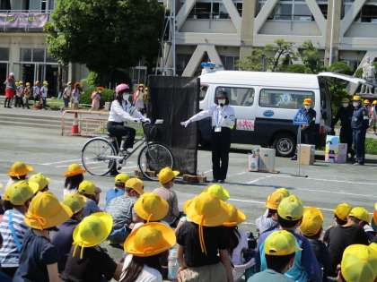 警察の方に来ていただき、安全な自転車の乗り方や、車の内輪差などのお話を聞きました。身近なことなので、どの子も自分のことのように真剣に話を聞いていました。今日学んだことを生かし、これからも交通安全に気を付けて過ごしてほしいと思います。