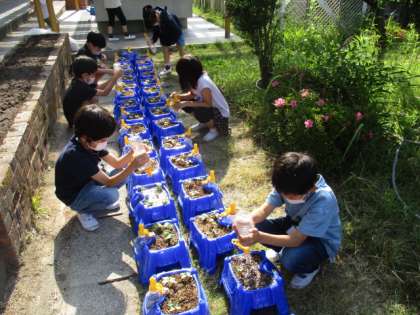5/19 1年生 大きくなあれ 公開日 2022/05/19 更新日 2022/05/19 1年生 1年生の教室前に、アサガオの鉢がずらりと並んでいます。朝一番のお仕事は水やりです。ペットボトルいっぱいの水を、丁寧に鉢にかけていました。 「昨日よりちょっと葉っぱが大きくなった気がする」 「大きくなあれっておまじないをかけるといいって聞いたよ」 今日もとっても愛おしそうな表情で見つめながら、しっかり水やりができました。
