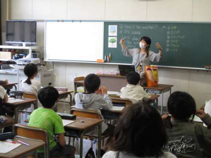 外国語活動の授業で、今日の天気を聞いたり答えたりする表現を学習しました。何回か口ずさんで表現に慣れたところで、天気予報の動画を見て、内容を確認しました。「どこの国の天気を伝えているかな?」「「天気はどうかな?」「ほかに聞こえてきた内容は?」聞き取れたことをどんどん発表していました。そして、雨季が何か月も続く国の生活について、話題が広がりました。