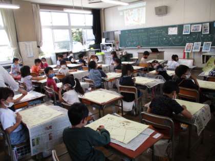 5/19 1年生 図工 「みてみてあのね」 公開日 2022/05/19 更新日 2022/05/19 1年生 「学校で楽しいことを絵に描こう」をめあてに、生活の中で楽しかったことや驚いたことなど、人に話したいことを思い浮かべながら、画用紙に向かっています。クレヨンを使って、画用紙いっぱいに描き始めました。顔の表情がとても生き生きしています。からだの動きは、なかなか難しいですが、表情豊かに描いていました。楽しかったイメージが表現されていました。