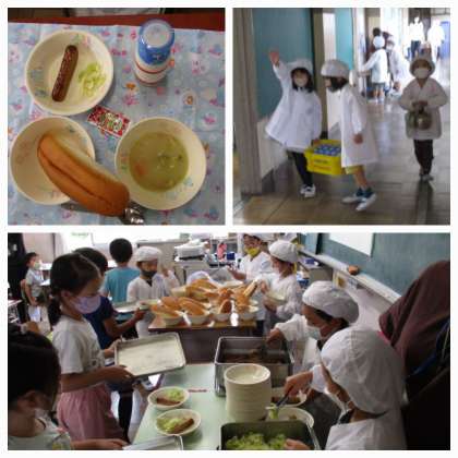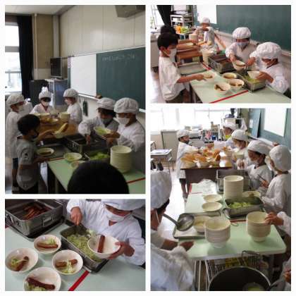 写真は1年生の準備の様子です。みんなで協力して、手際よく準備が進められるようになってきました。今日はつけ分けるものが多くて大変でしたが、どの学級も上手にできていました。大きな成長です。