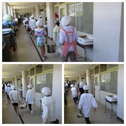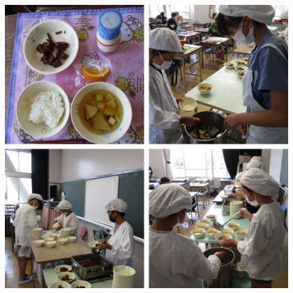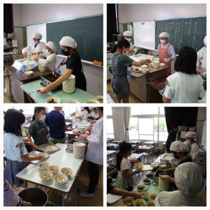 写真は5年生の準備の様子です。汁物は汁と具の配分がなかなか難しいですが、お玉で汁を足したり、具を足したりしながら、丁寧につけ分けをしていました。みんなで協力して手際よく準備を進め、今日も笑顔で「いただきます!」