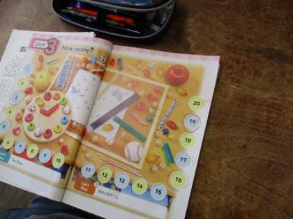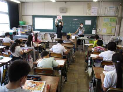 外国語活動の授業で、「How many?」を学習しています。最初に、1から20までの数の言い方や、数の尋ね方を何度も声に出して言ってみました。だんだんそろってきたところで、教科書に書かれている1〜20までの数字からいくつか選んで〇をつけます。ここからが勝負です。みんなで「How many?」と先生に尋ねると、1から20まで書かれたカードから先生が1枚ずつ引きます。その数字と、教科書に〇を付けた数字とどれだけ当たるかを競争しました。先生の英語に一喜一憂でした。ばっちり数字は当たらなかったかもしれませんが、先生の英語を正確に聴き取ることができて、数字はばっちりです。