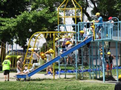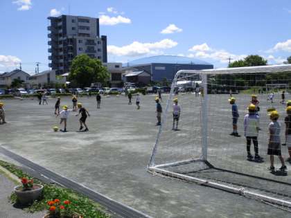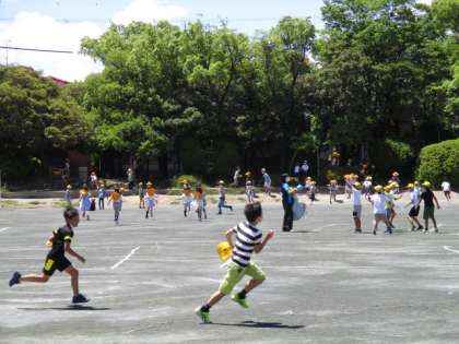 写真は、大放課の運動場の様子です。青空の下、元気いっぱいです。
