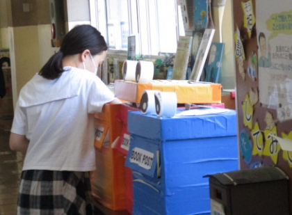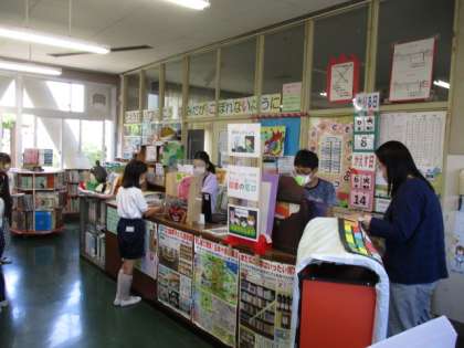 6月の「あじさい読書月間」が始まってから、大きな放課には、たくさんの神山っ子たちが図書館に向かいます。借りたい本を見つけると、図書委員さんがカウンターのところで「ピッ」っと手続きをしてくれます。図書委員会の企画「わくわく本袋」も大人気です。また、カエルの返却ボックスに返された本を取り出し手続きをし、本棚へ戻すのも、図書委員さんがやってくれています。大忙しですが、しっかり仕事を進めてくれるおかげで、みんなが安心して本を借りることができますね。