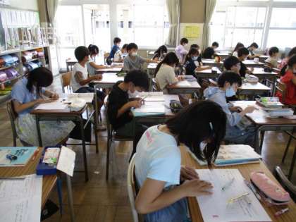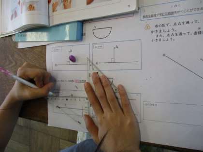 算数の授業で、「垂直と平行」を学習しています。今日は1組の三角定規を使って、垂直の直線を引く方法を学習しました。直線に1つ目の三角定規を「ぴったり」とあて、その三角定規に、もう一つの三角定規を「ぴったり」とあわせて直角をつくります。三角定規を「ぎゅ」っと押さえて、直線を書くと、垂直の線がかけます。三角定規が動かないように、手や腕に力いっぱい入れて取り組んでいました。「ぴったり」「ぴったり」「ぎゅ」で美しい直線がかけると、ほっとしてうれしそうでした。この後、平行の直線へと学習は進んでいきます。